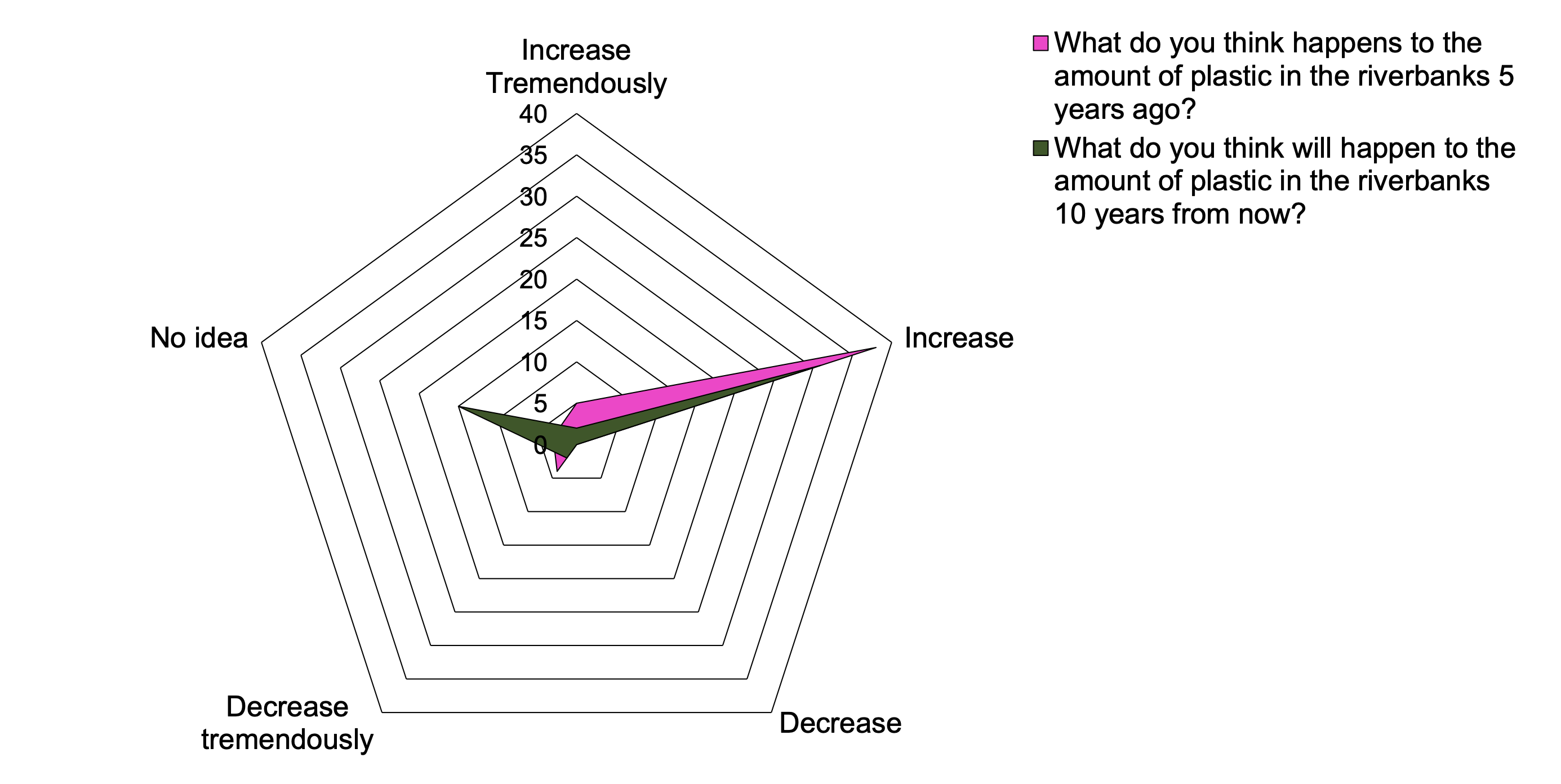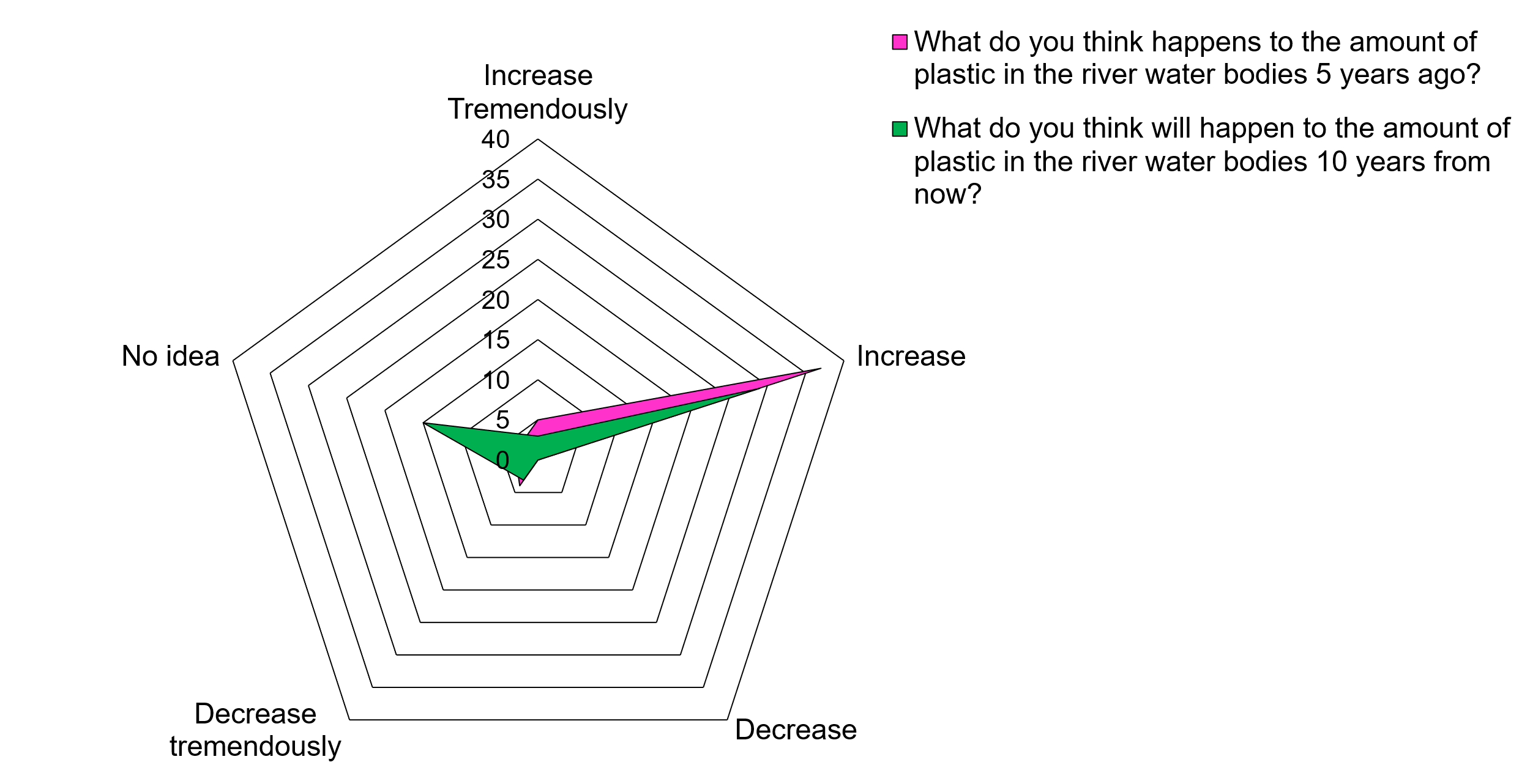 As shown in Figure 2, most respondents perceived that the amount of plastic litter in the river water bodies has increased from the past 5 years (n=37, 74%). Similarly, results show that 58% of the respondents also perceived that there will be an increase in the amount of plastic litter in the river water bodies 10 years from now (n=29). Overall, participants perceived that there has been a tremendous increase in the number of plastics over the past 5 years; likewise, plastics in the river water bodies will increase in amount over the next 10 years.