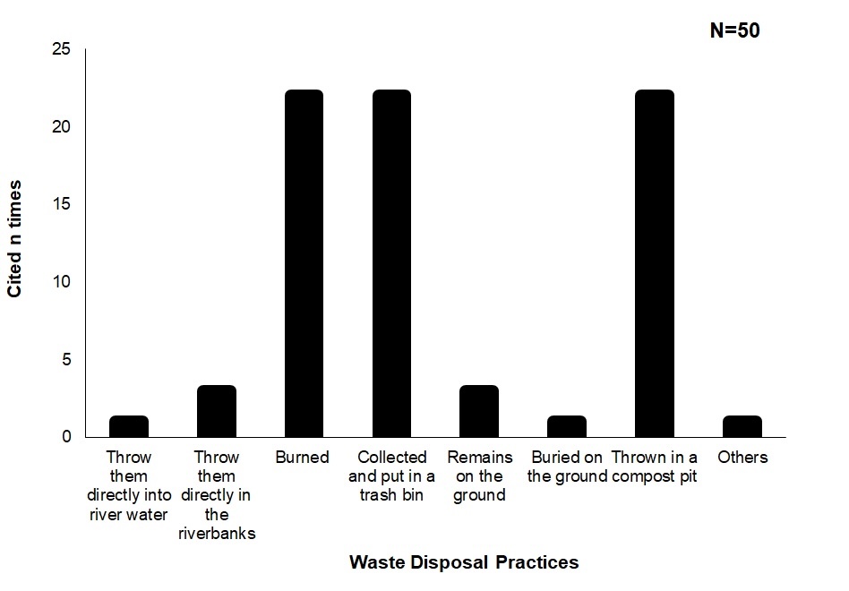 Figure 4 shows the waste disposal practices’ response of the locals along the Pulot River and its tributaries. The question consists of multiple-choice answers; therefore, the participants were allowed to select more than one option. The majority of the respondents throw their garbage in a compost pit (n=22, 44%), collect their garbage and put it in a trash bin (n=22, 44%), and burn their garbage (n=22, 4%). Other waste disposal practices of the respondents also include; throwing them directly into the riverbank (n=3, 6%), remained them on the ground (n=3, 6%), buried them on the ground (n=1, 2%), throws them directly in the surface water (n=1, 2%) and others (n=1, 2%).