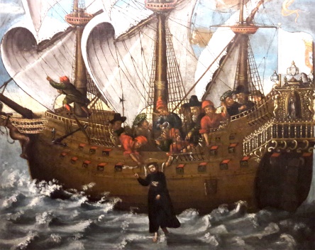 The information about Jesus walking on the waves of the sea among the miracles of Jesus and even the fact that the sea monster “Rahab”, which symbolises the forces of chaos and evil mentioned in Canaanite myths, bowed down to him is mentioned in Job (1-13) in the Bible (Kutsal Kitap, Eski Antlaşma, Eyüp, Bölüm 9/42. 2025, Februrary 19). Standing on the sea and helping the seafarers in difficulty is among the miracles of Mevlânâ (And, 2010:414). Apart from the prophets, it is also necessary to mention the existence of saints related to the cult of the sea. For example, St. Nicholas, for whom there is a church in Antalya Demre, is believed to have rescued people lost at sea and brought back their goods. It is even said that he resurrected a young man who fell overboard and drowned while travelling to Jerusalem. Due to his protection and rescue of sailors, the origin of the belief was attributed to Poseidon from the ancient Greek pantheon, and it was stated that he was his Christianised counterpart (Işık, 1997:460). In the Black Sea region, St. (Hagios) Phokas protected sailors (Karasalihoğlu, 2022:706). Another of these saints is St. Francis Xavier, who lived between 1506-1552 (Frei and Madella, 2021:16). His miracle during his voyage from the Singapore Strait to the small Sanchoão of China is described. During this voyage, the crew and five hundred passengers on the ship, which could not sail due to lack of wind, were dehydrated. Thanks to St. Xavier's blessing of the sea and his prayers, the sea water was sweetened and the sailors met their water needs in this way (Sousa, 2006:65). This event has been depicted in some Western iconography as Xavier's feet touching the water, causing it to become sweet (Fig. 1).