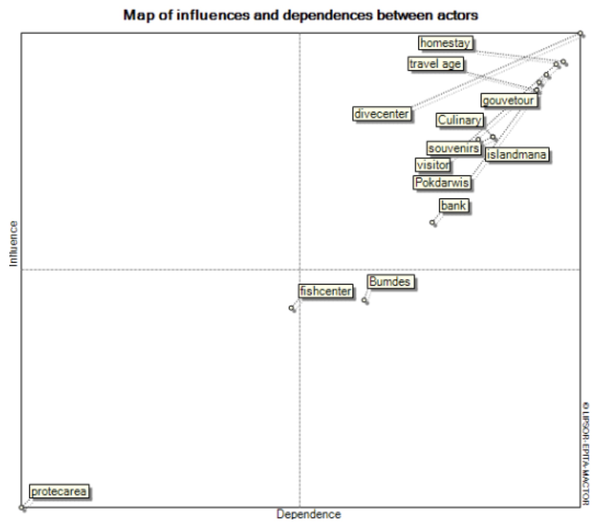 According to Figure 1, tourism managers are significantly influenced by and dependent on the balance between tourism development and ecosystem sustainability. However, in practice, tourism businesses often fail to implement sustainable tourism development practices. Conversely, ecosystem management actors exhibit relatively weak dependence and influence. As illustrated in Figure 1, stakeholders with high levels of influence and dependence include: culinary entrepreneur, fashion and souvenir vendor, accommodation provider (homestay), visitor, travel agent, dive center, community-based tourism group (Pokdarwis), bank, island tourism management.